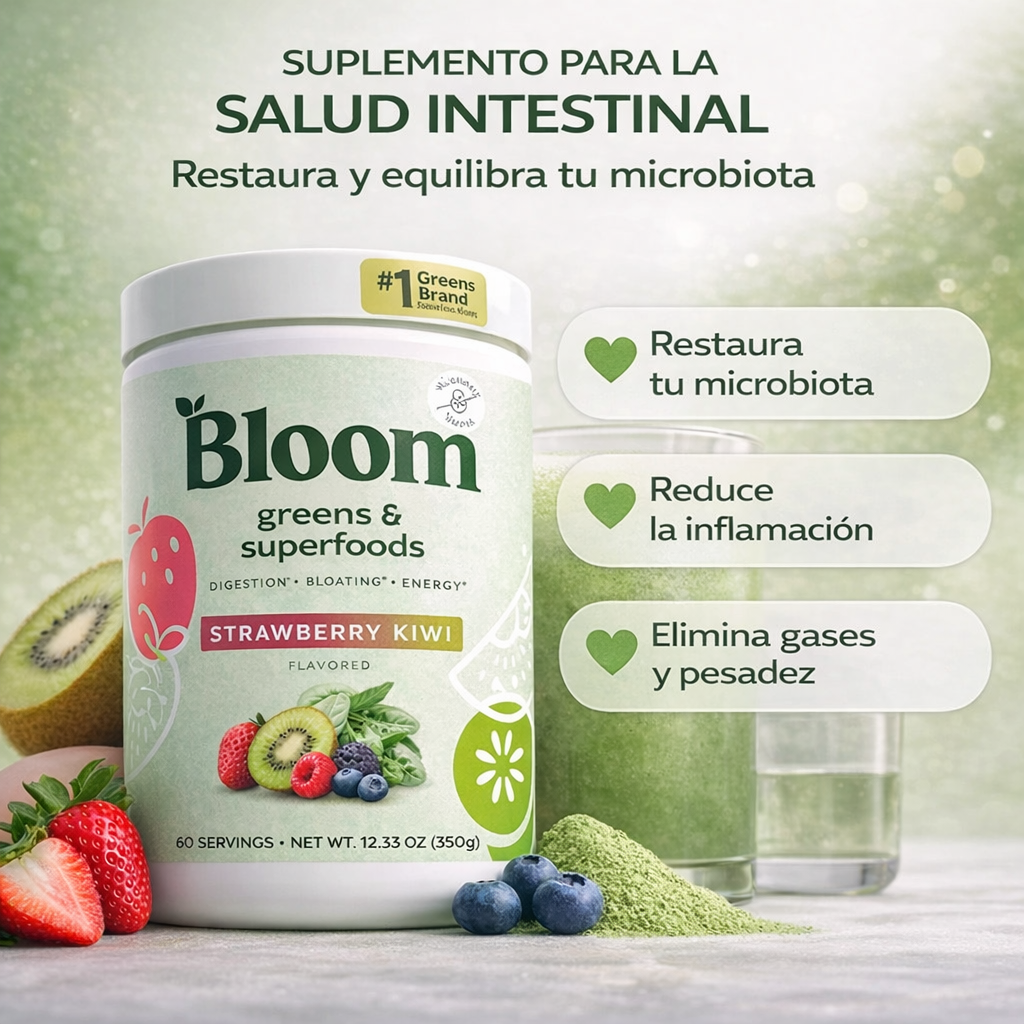Gracias a su combinación de probióticos avanzados, enzimas digestivas y fibras naturales, Bloom ayuda a equilibrar tu intestino y mejorar la digestión. Perfecto para quienes quieren sentirse más cómodos después de comer y mantener un sistema digestivo saludable.